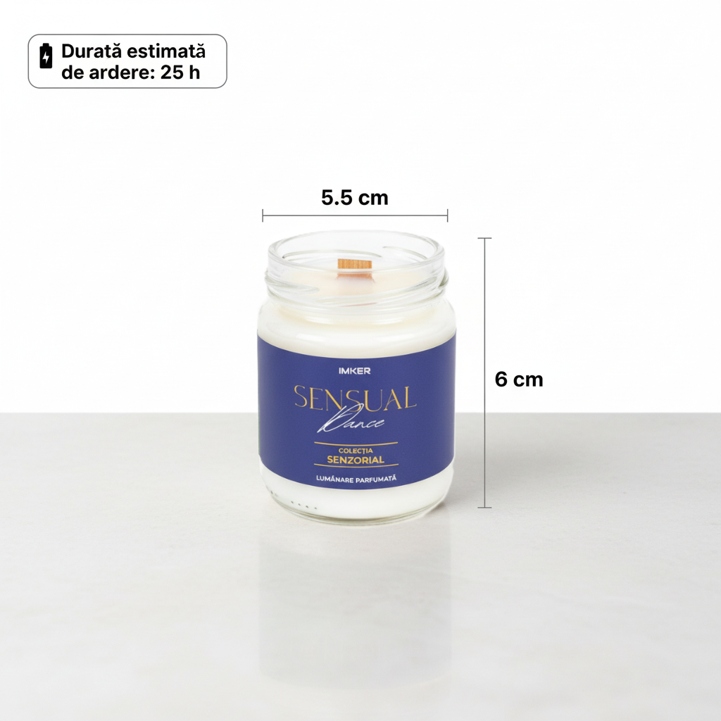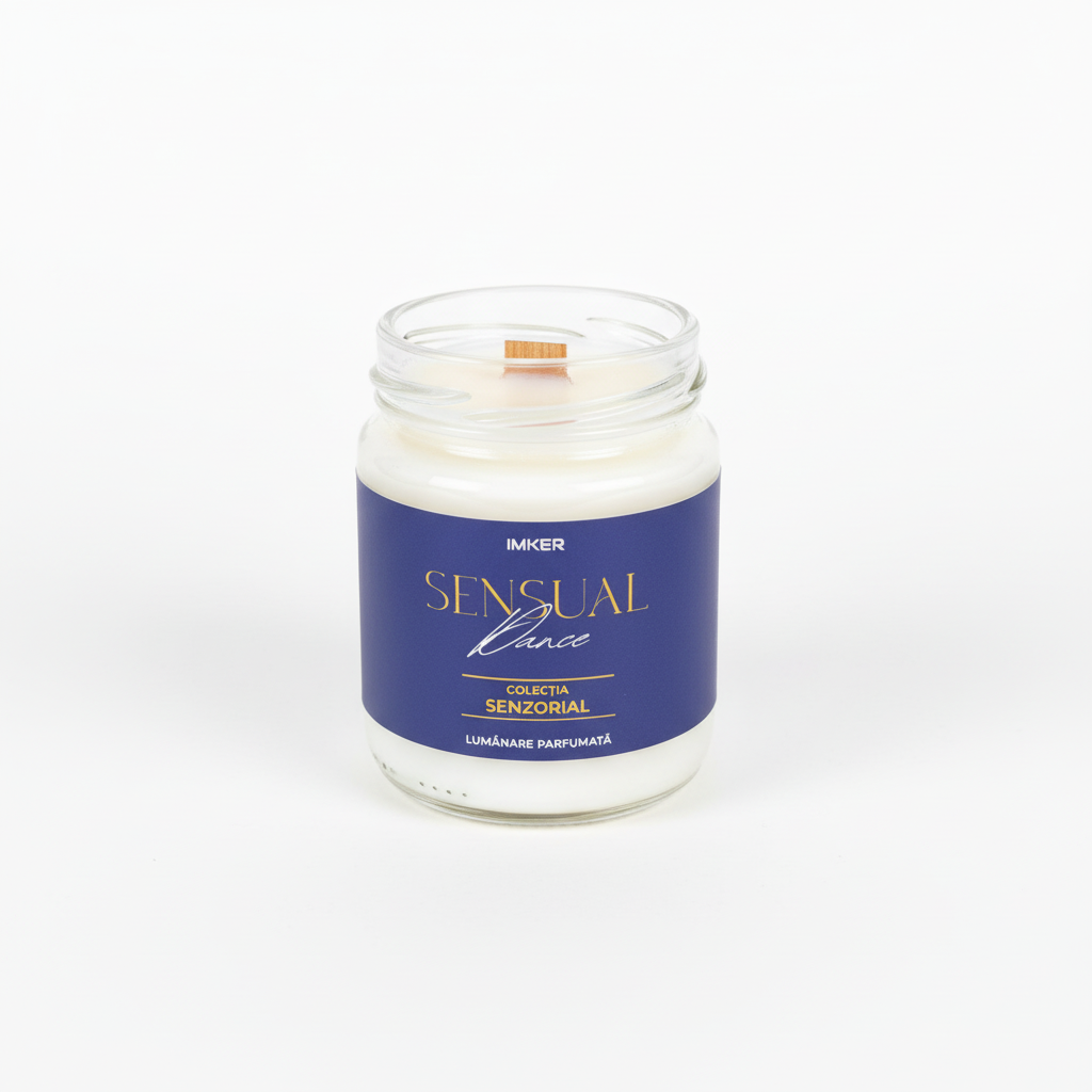 Lumânarea IMKER Senzorial Sensual Dance este realizată din 100% ceară naturală de soia, parfum și fitil de lemn special, care emite un sunet plăcut, asemănător trosnetului lemnelor în șemineu. Nu conține parafină, fiind biodegradabilă, non-toxică și eco-friendly.